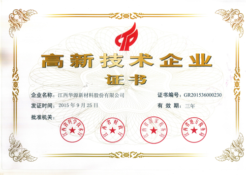 2015年9月25日,我集團江西華源新材料股份有限公司被認定為江西省高新技術(shù)企業(yè),并獲得江西省“高新技術(shù)企業(yè)證書”。一直以來,我們都大力鼓勵及推進企業(yè)的技術(shù)創(chuàng)新,目前,我公司已擁有實用新型專利15項,申請專利4項。