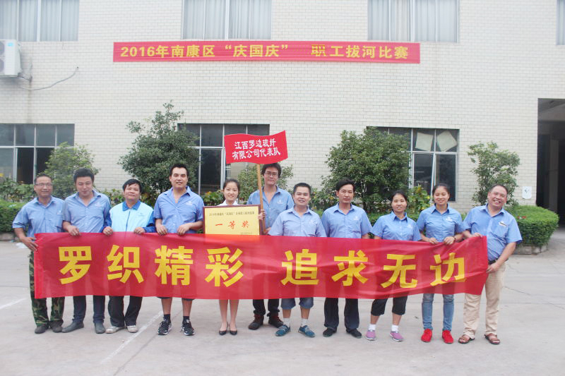 9月28日上午,為了豐富工業園區職工文化生活,迎接國慶佳節的到來,由區總工會、區體育局組織開展的2016年南康區“迎國慶”企業職工拔河比賽在龍嶺工業園東區勝利開賽。我公司代表隊由玻纖網事業部組隊參賽,在比賽中不畏強手,奮力拼搏,以勇爭第一的豪氣,一路過關斬將,在22支參加隊伍中脫穎而出,會師決賽,喜獲比賽一等獎,為公司爭取了榮譽,展現了羅玻風采。